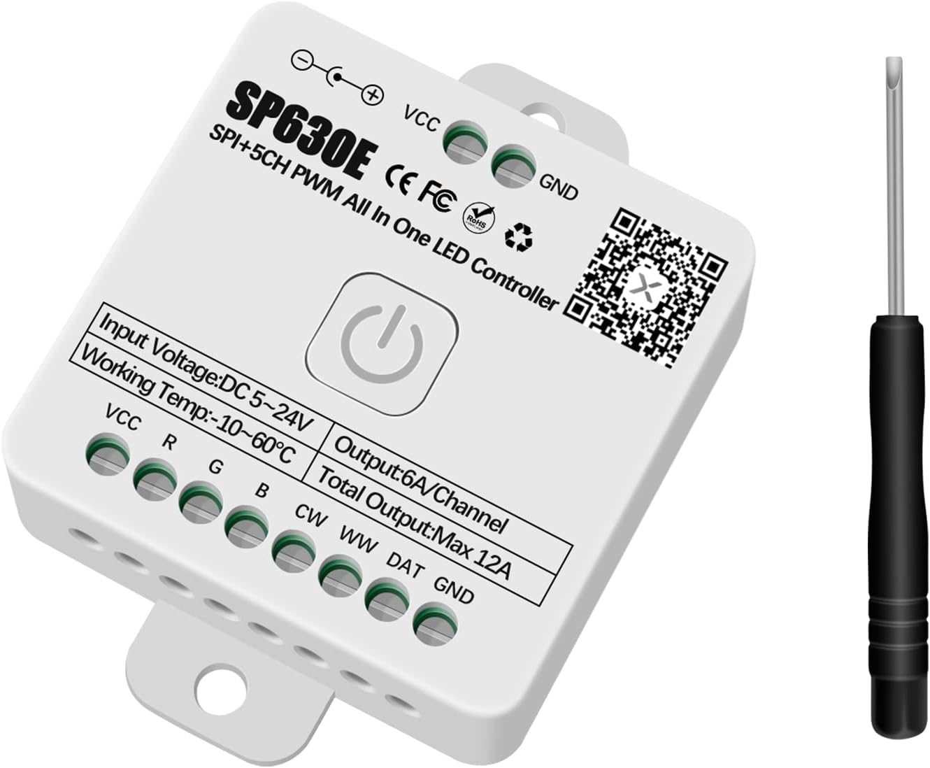 SP630E is SPI+5CH PWM all in one led controller, it can compatible with multiple types of LEDs. Such as 1/2/3/4/5CH W/CCT/RGB/RGBW/RGBCCT PWM/Addressble LEDs and Addressble+PWM combined LEDs. Features:1. High performance, low power consumption Bluetooth microprocessor.2. Compatible with 12 kinds of type of LEDs.3. Support App control, 2.4G touch remote control and 2.4G touch 86-type control panel. 4. The remote control and 86-type control panel can be set up for zone-control (can be divided into 4 zones), or unified control (ALL).5. Support to set kinds of on/off animations and the default power-on state.6. Support for modifying device name, color order correction and setting timers.7. Support 3 kinds of music capture modes: cell phone microphone, player streaming, on-board microphone.8. 5 major control pages in the App: dynamic, static, music, custom and setting. select different types of LED correspond to different App page content.